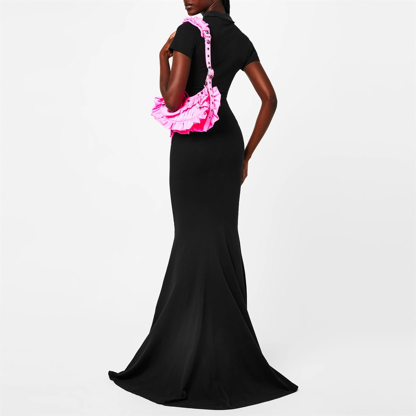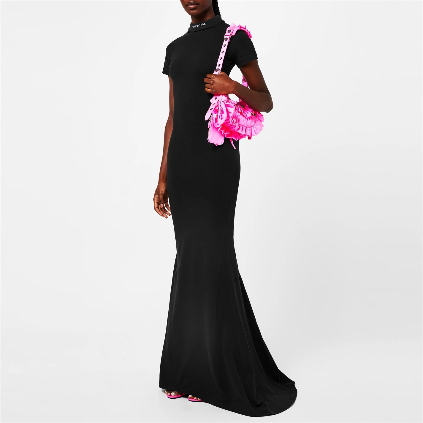Presenting the T-Shirt Maxi Dress from Balenciaga, the iconic house acclaimed for its ability to fuse streetwear with high-end fashion to create edgy, stylish pieces that redefine modern luxury. This striking design, meticulously crafted in premium stretch-cotton jersey, showcases a classic roll neck framed by short sleeves, providing a chic, minimalist appeal. The elongated, floor-length fish-tail hemline adds dramatic flair to this sleek silhouette, and the solid block colour delivers timeless elegance- ensuring an exceptional platform to style it with any accessories. The contrasting embroidered logo on the neck gives the dress a contemporary feel that is unmistakably Balenciaga. Whether dressing up or down, the T-shirt Maxi Dress will undoubtedly become your next wardrobe staple.