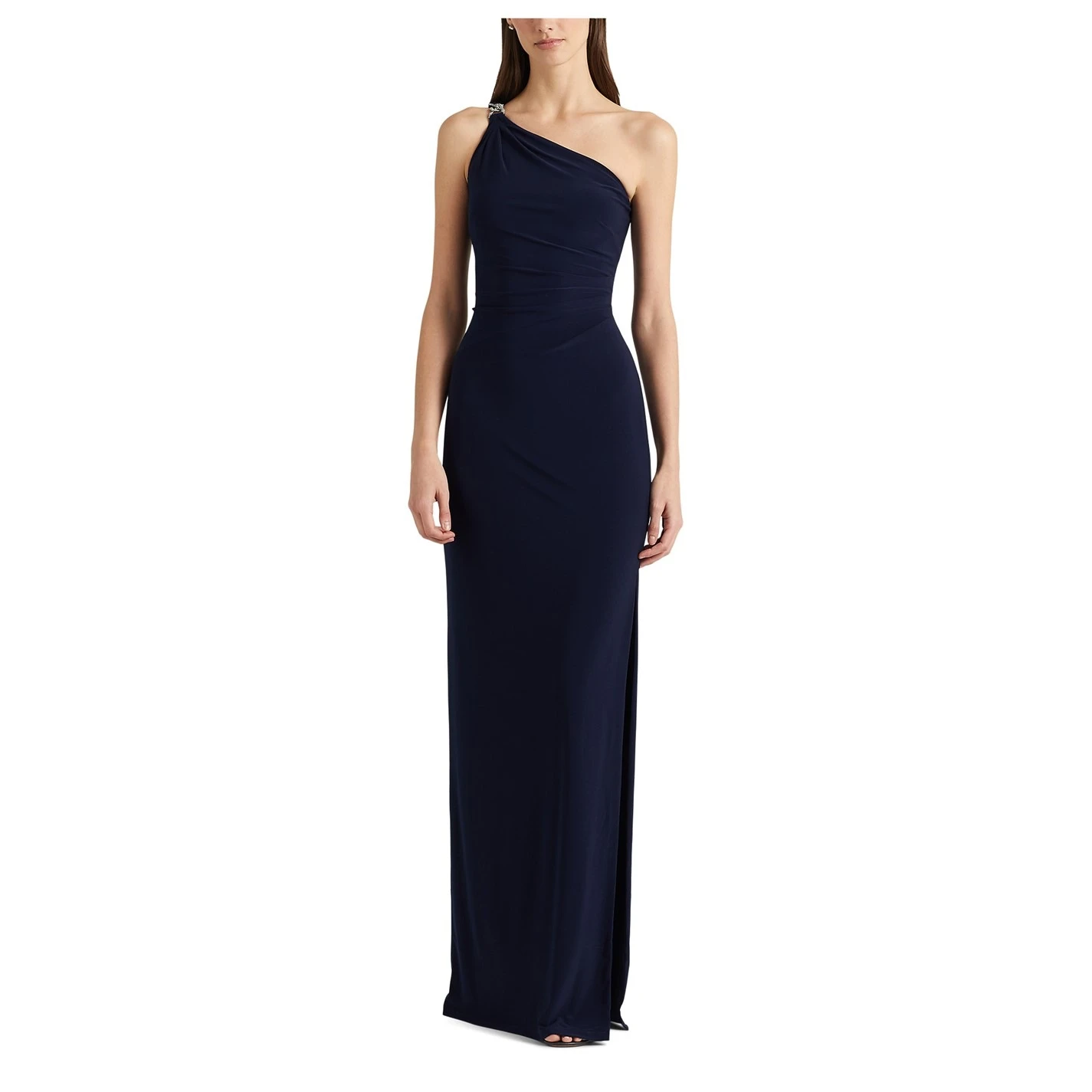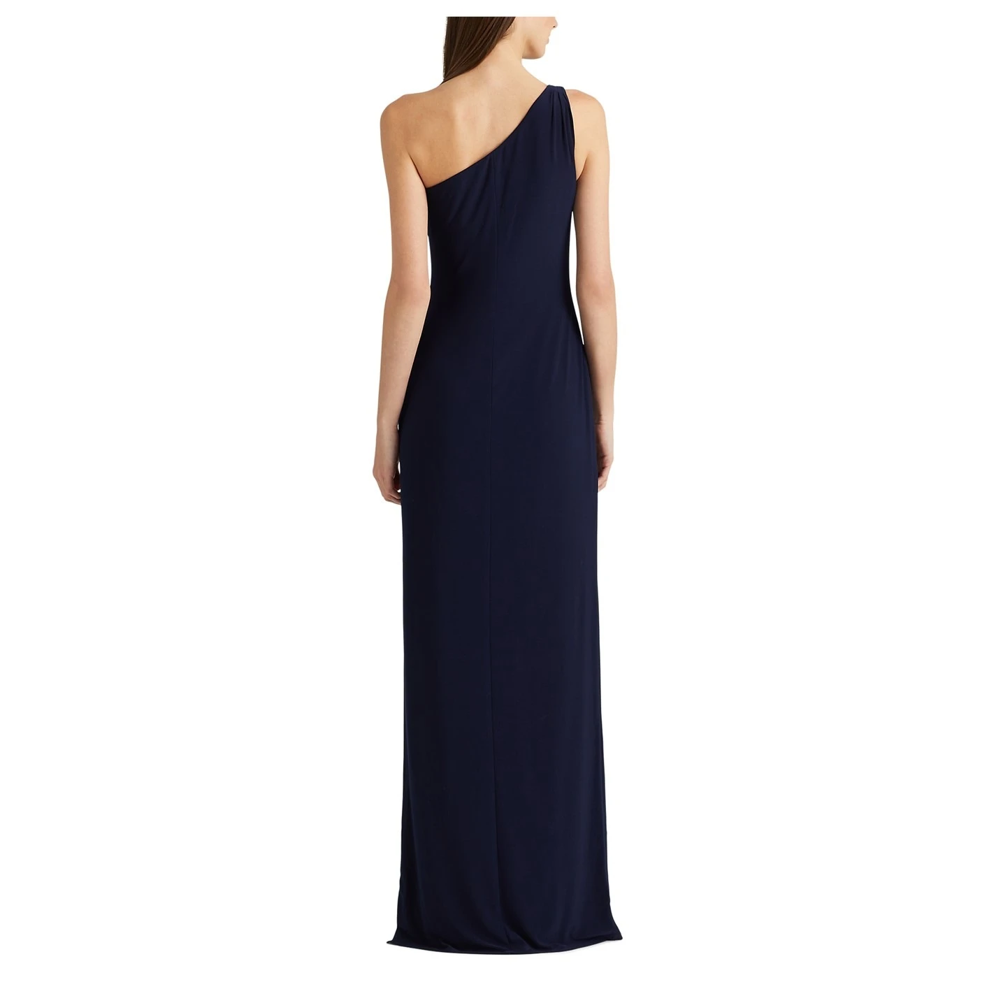 Step out in true elegance with the Lauren by Ralph Lauren Belina Maxi Dress. A sleek double lined piece with subtle ruched detailing at the waist to help achieve a flattering silhouette. With the one shoulder neckline adorned with a chain-link accent for a luxurious appeal, the floor length makes it the most perfect ball gown.