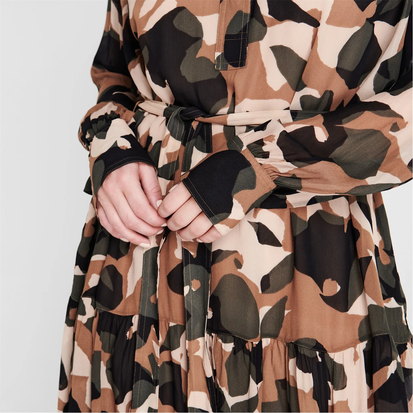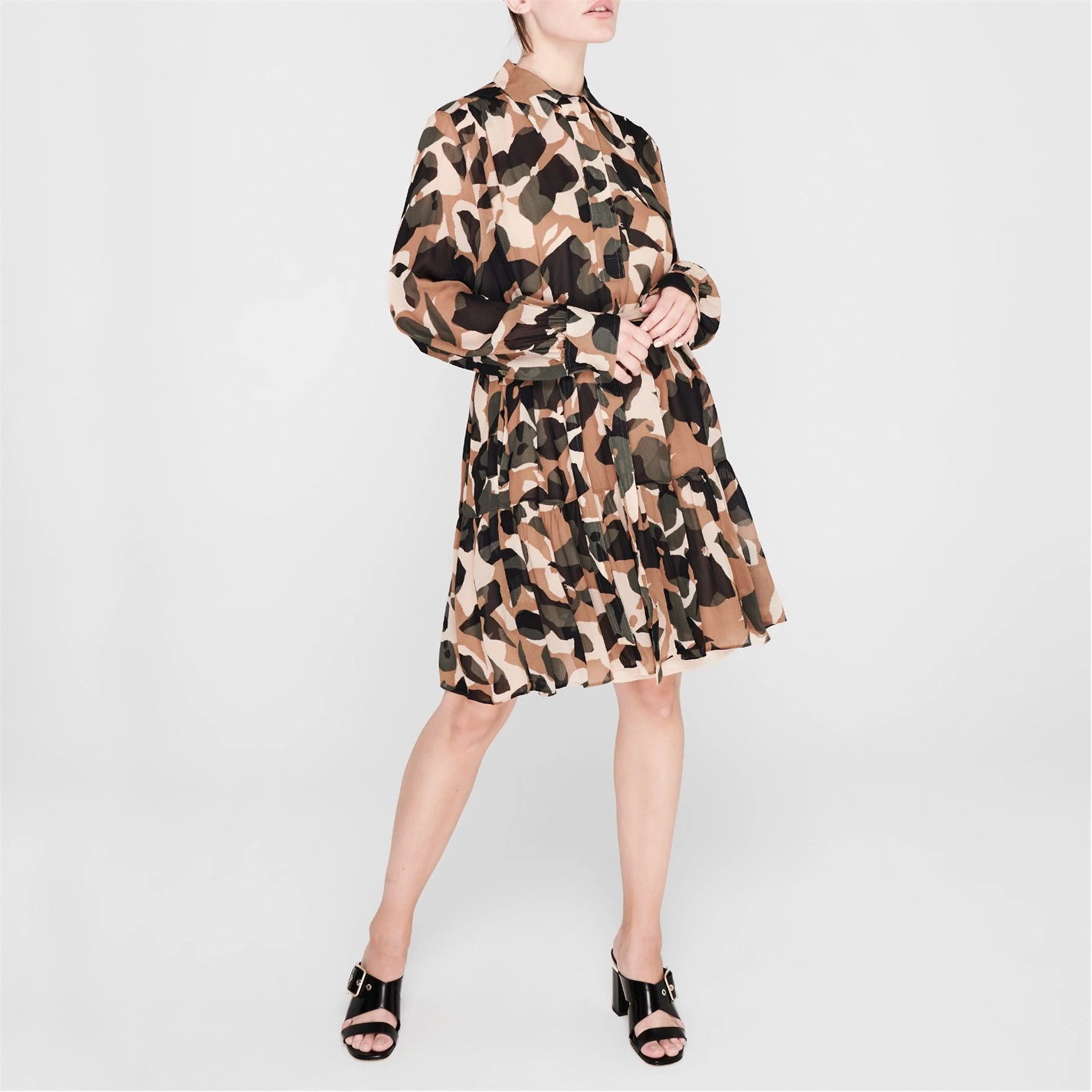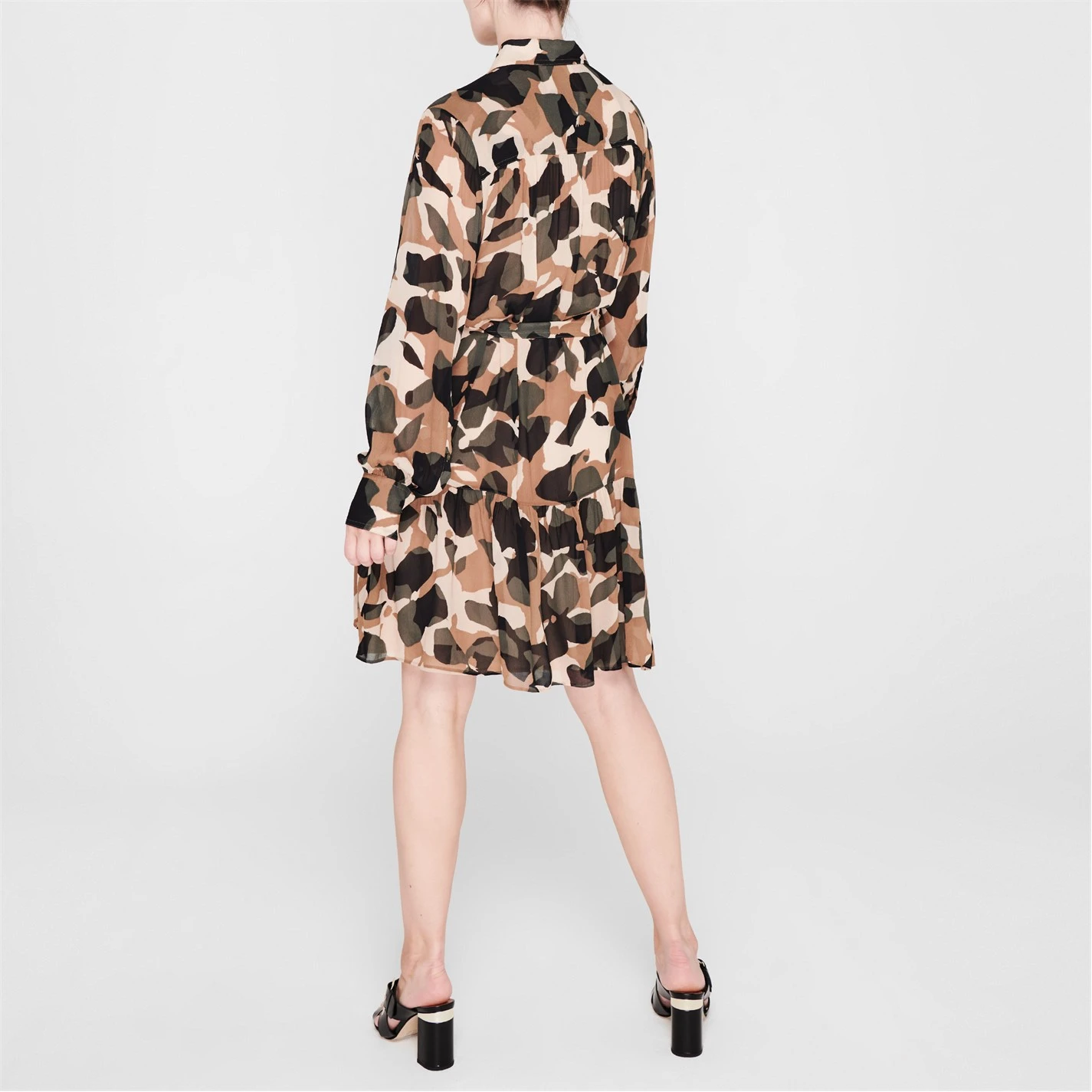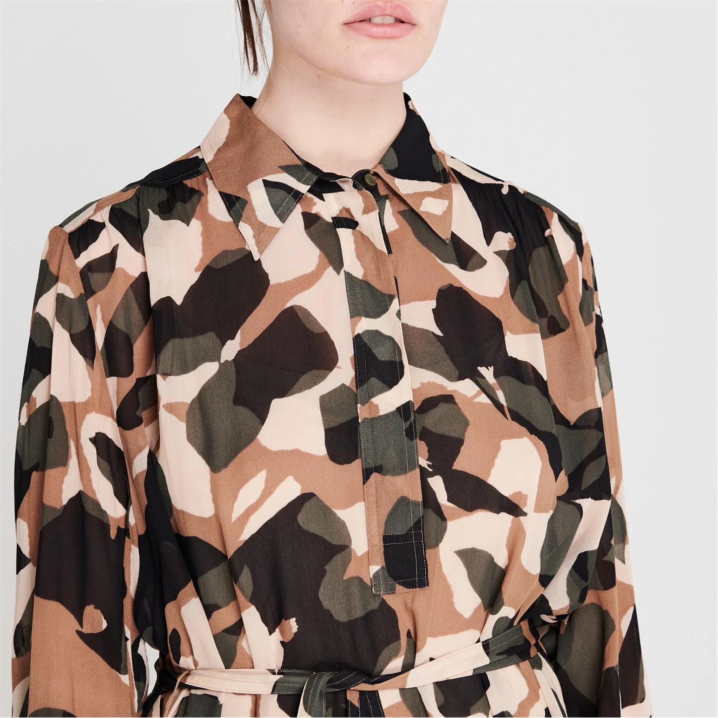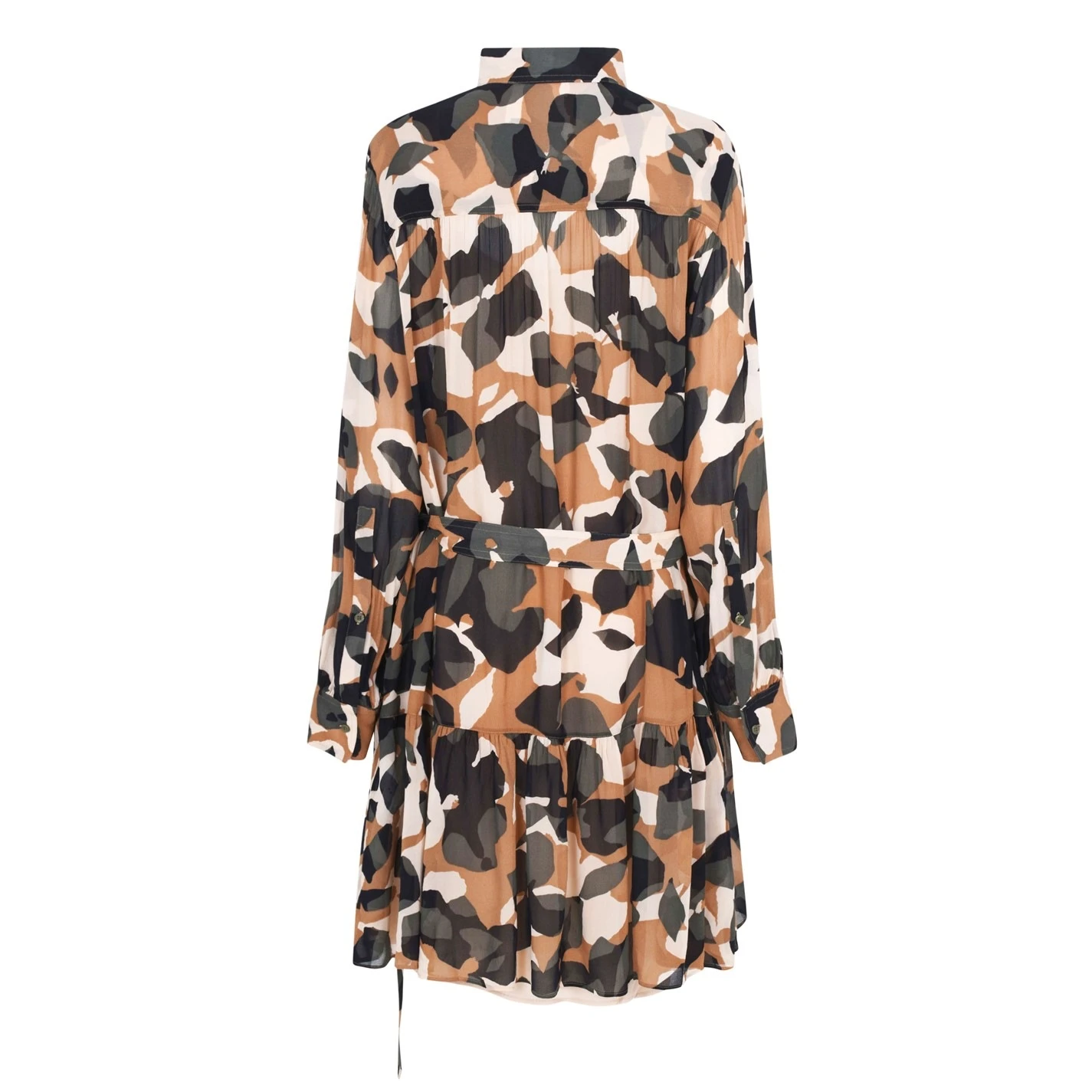 Printed with an all-over camouflage design, this knee-length dress details long-sleeves cuffed with a button fastening, detachable slip dress, concealed button placket to the classic collar and a flounce hem in a regular-fit silhouette. Complete with a tie belt fastening to the waist which can be removed for an adaptive styling. Pair with boots and a leather jacket.