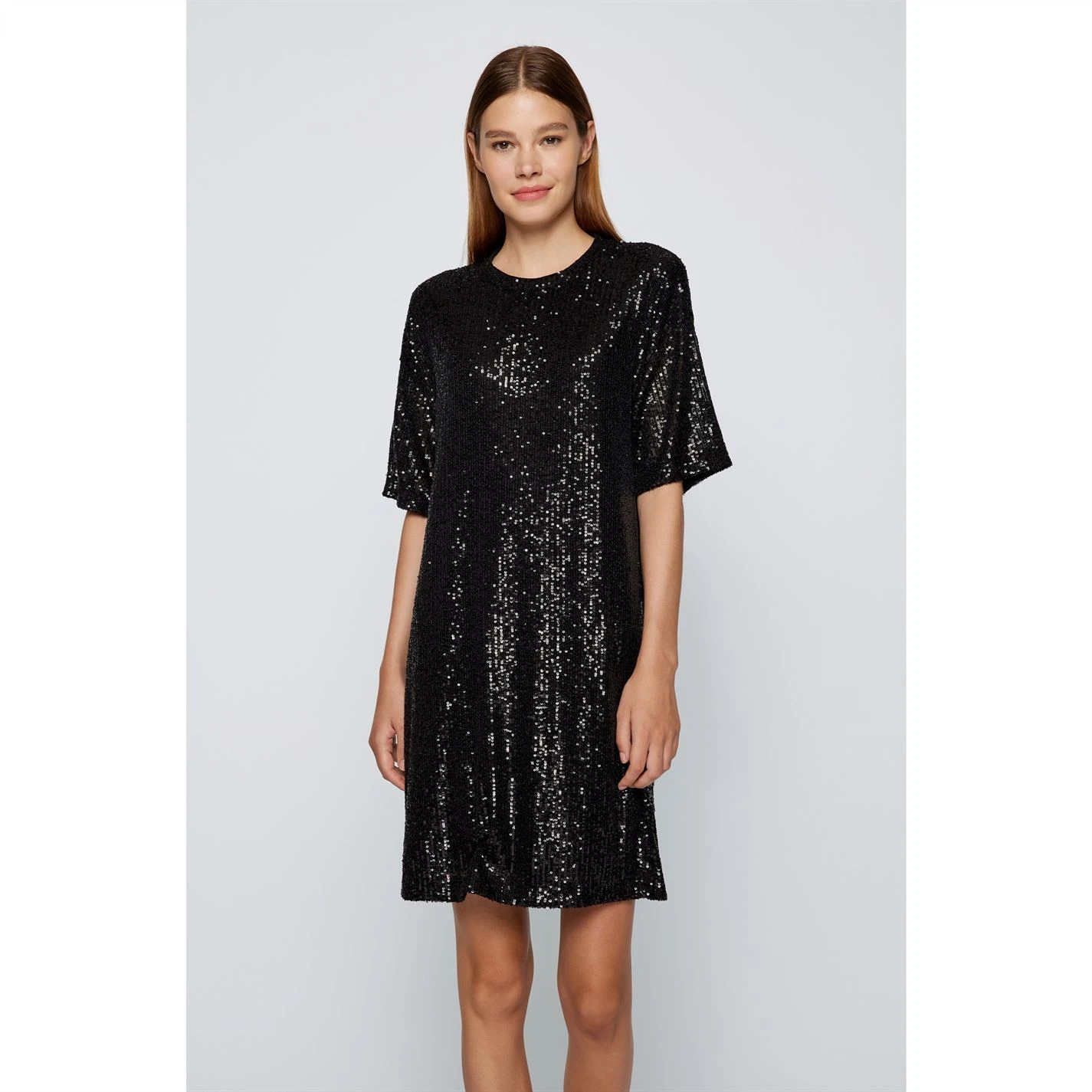 Elevate your collection with this BOSS Esseni Sequin Dress. Crafted with short sleeves and a crew neckline for a classic look, it features elasticated hems for a comfortable fit. This dress is an all over sequin design and is complete with BOSS branding.