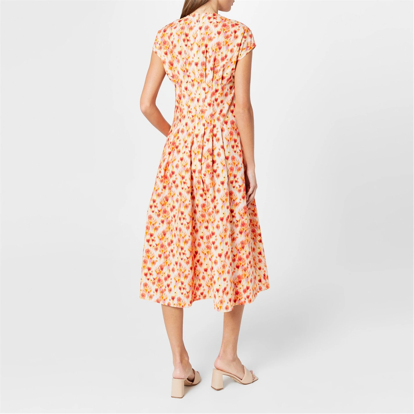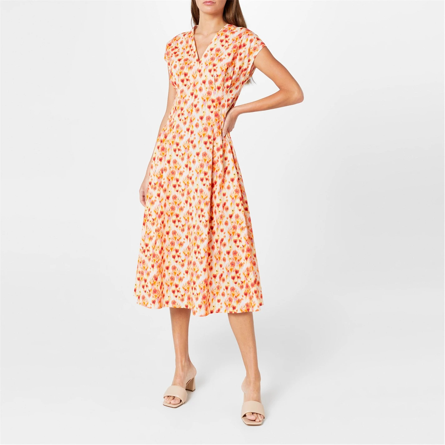 Floral and feminine this elegant Max Mara dress embraces the spirit of summer for a radiant appeal. This sweet digione dress has been expertly crafted from a luxurious 100% cotton for a breathable, supple feel, that makes for a stylish and comfortable wear, a must have in your seasonal wardrobe. Perfect for picnicking in the local park, or for bike rides along the canal this sweet piece is adorned with all over yellow and red flowers for a romantic hue, especially with the sleeveless design, sultry V neckline and cinched waist for a look that accentuates the contours of your frame for a flattering finish. Falling just below the knee this modest look, offers a rear zip fastening for ease of wearing and pairs well with brown strappy sandals and light jewellery. Professional Dry clean.