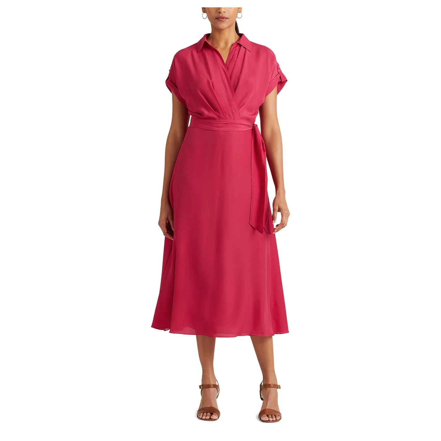 Step out in style with the Lauren by Ralph Lauren Fratillio Crepe Dress. Cut in an a-line silhouette with a tie fastening around the waist for a flattering fit, the spread collar and midi length adds a touch of formality. Finished off with short sleeves with rolled cuffs, this dress will be perfect during the warmer months.