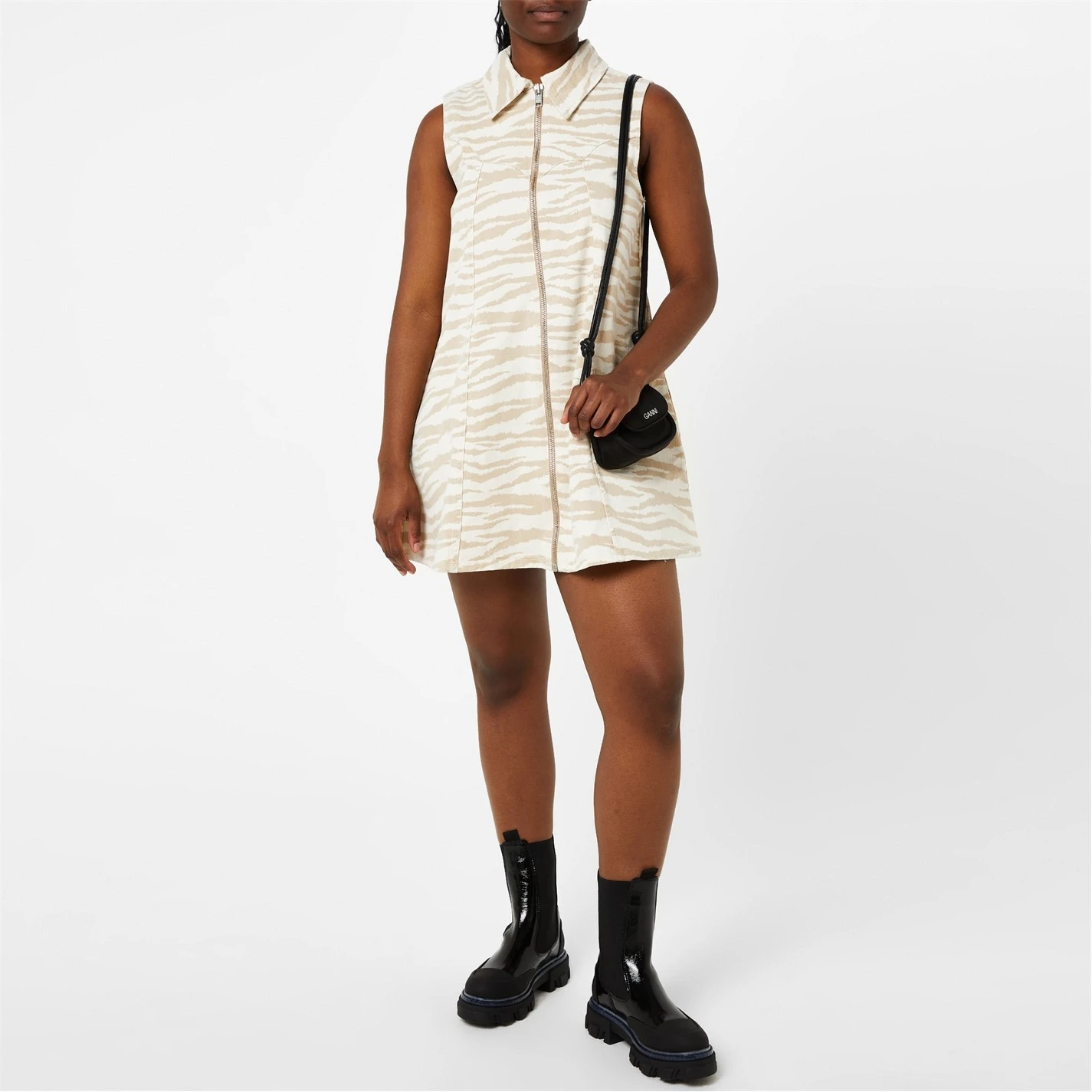 Embrace your wild side with this animal denim dress by Ganni. Innovative and subtle this sophisticated look has been experlty crafted from a responsibly sourced organic cotton construction achieving a breathable, lightweight wear that is both comfortable and trendy a must have in your summer collection. Designed in a white and khaki zebra print with a point collar and two welt side pockets for ease of wearing, keeping your essentials close. Offering a front zip fastening with a sleeveless feature this look is unique and easy to style with it’s A line silhouette. Machine Wash to care instructions.