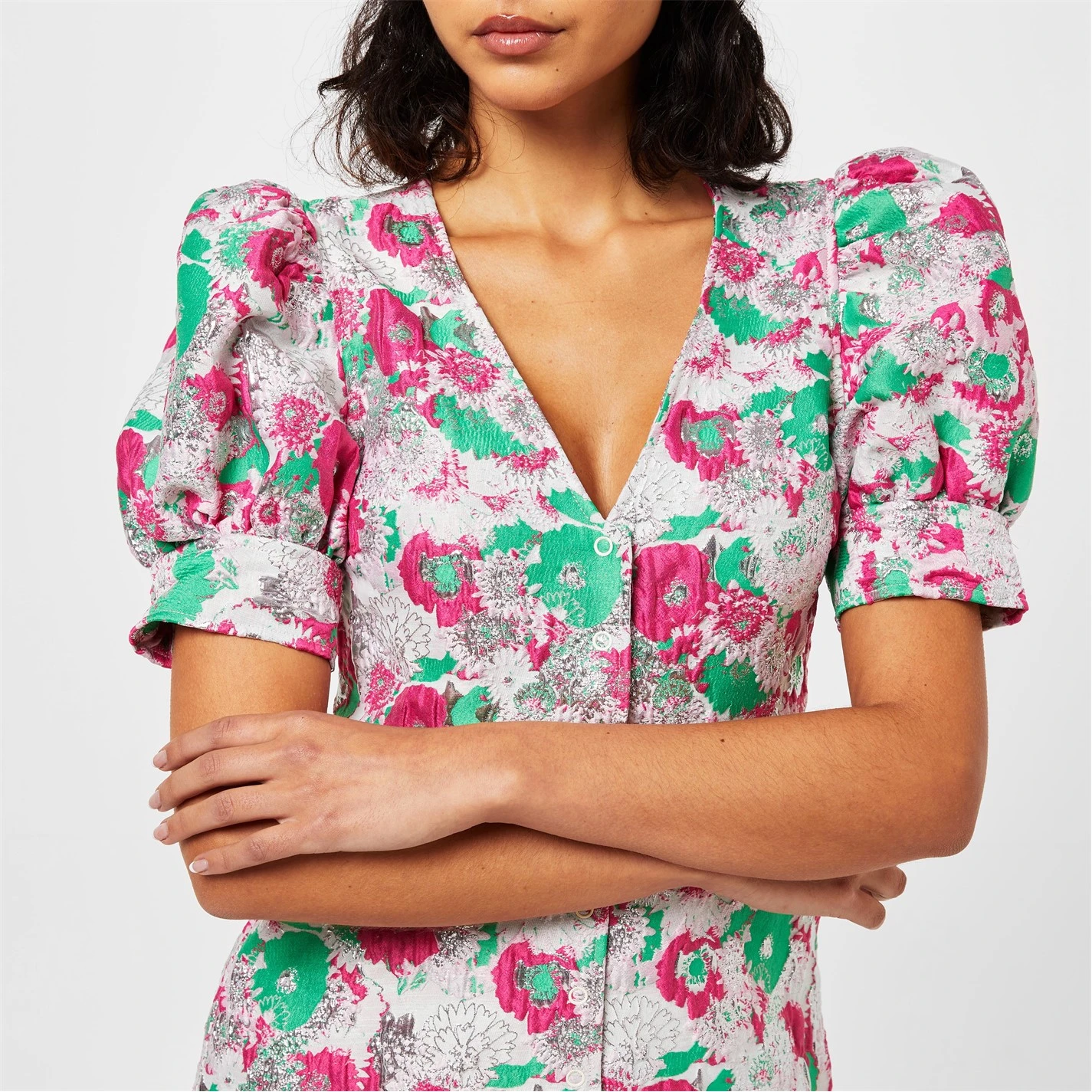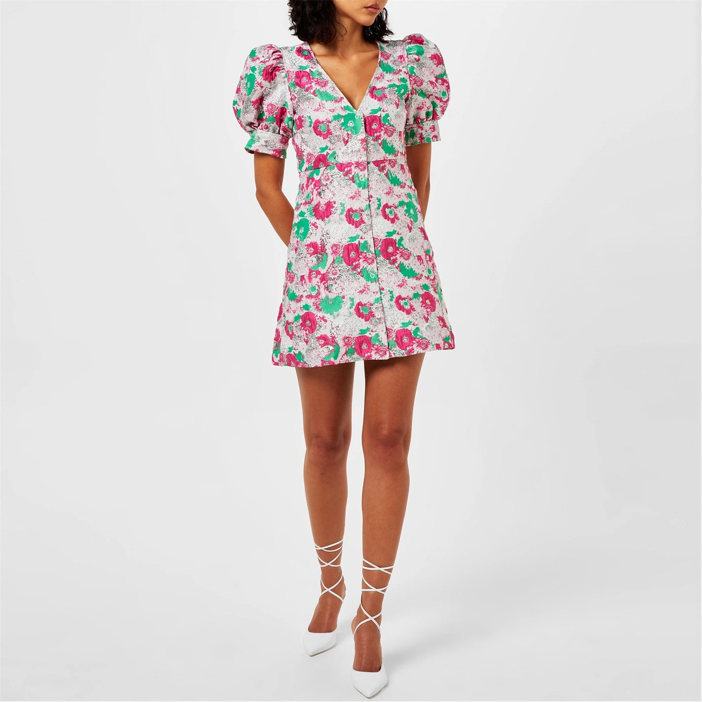 Refresh your summer attire selection with the Ganni Jacquard Floral Mini Dress. Crafted from a recycled polyester fabrication, this mini length silhouette is defined with a ditsy floral print for a jacquard styling while the flattering v-neckline offers a feminine allure. Styled with exaggerated short puffed sleeves, this garment is secured with a popper fastening to the centre placket while the look can be styled with vibrant mules and a small clutch bag. 71% recycled polyester, 17% metallic yarn, 7% polyamide, 5% polyester, machine washable.