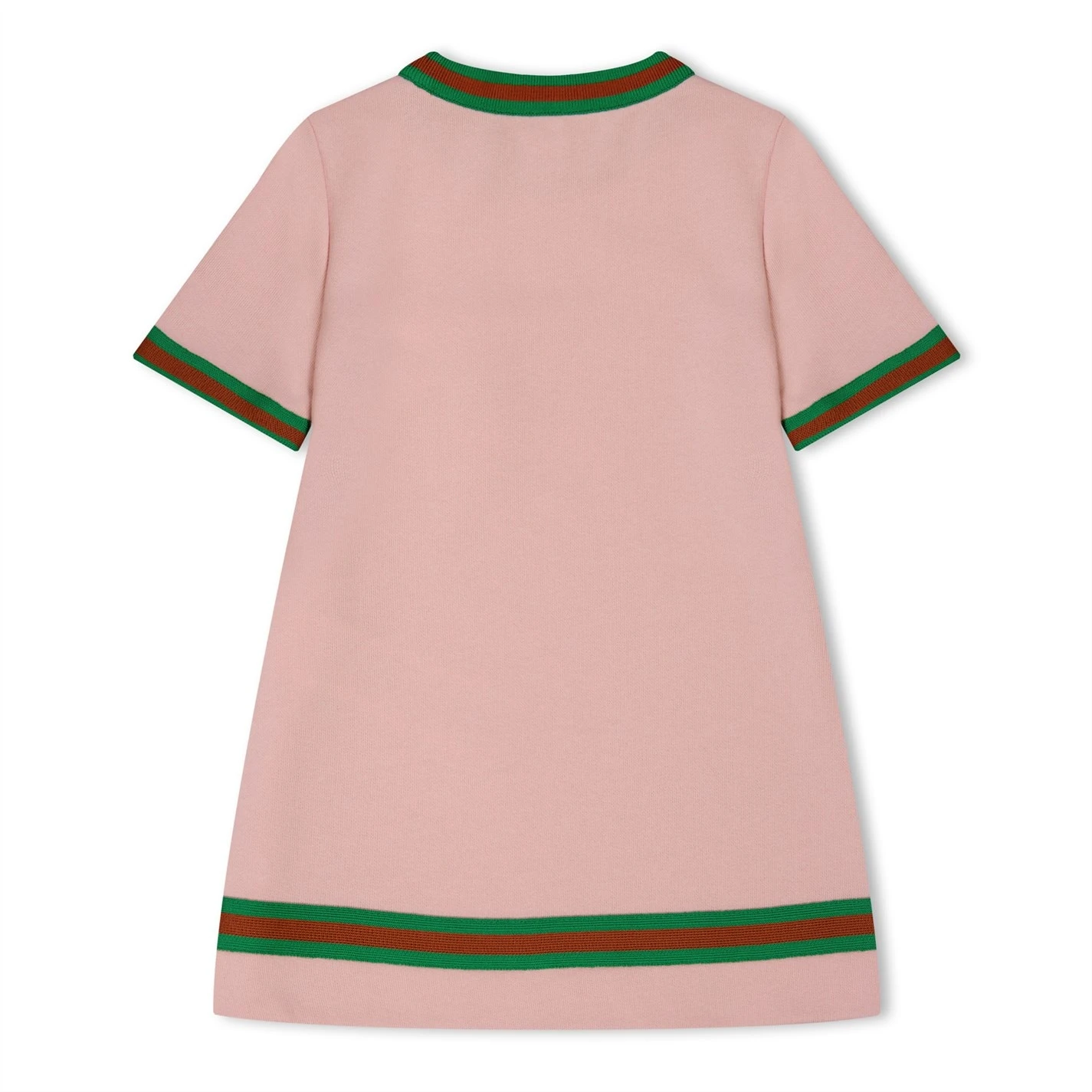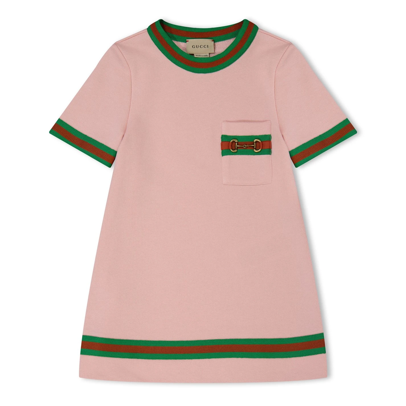 Spoil your young fashionista with this Tipped Dress from Gucci. Crafted in Italy using premium cotton jersey in a minimalistic colourway throughout with contrasting striped knit trims and defined with the iconic Horsebit emblem in a gold-toned metal hardware to the breast pocket. This dress is designed with a relaxed style with features including a crew neck, short sleeves and a straight hem all delivering effortless elegance to your little one. Material composition: Fabric: cotton. Collar: 88% cotton, 11% polyamid/nylon, 1% elastane. Details: polyester. Hand wash only.