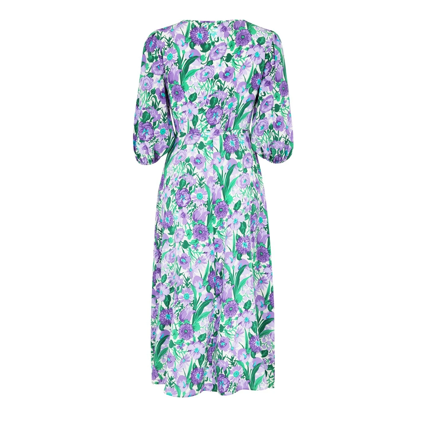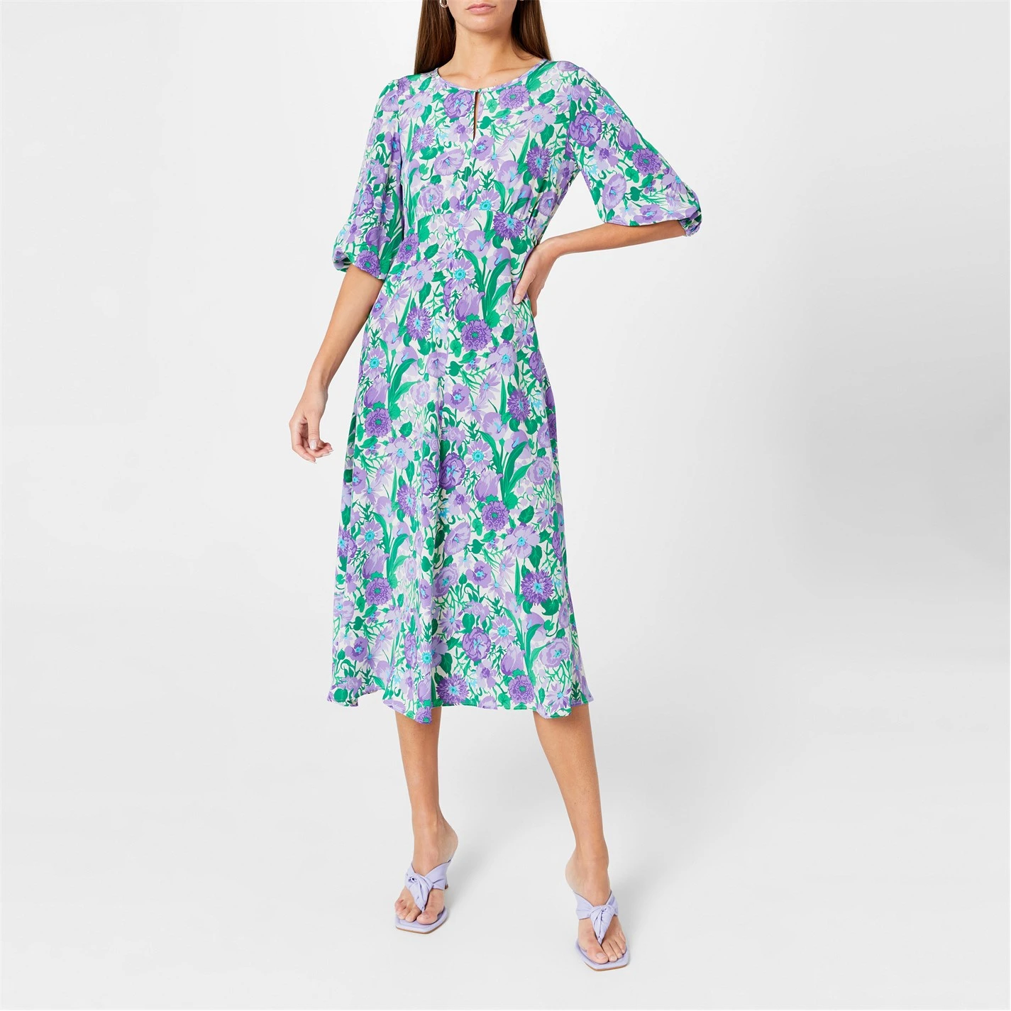 Invest in this Max Mara Weekend Jupiter Dress in printed pure silk crepe de chine fabric. The fluid-fit model boasts a darted waist and keyhole detail-adorned boat neckline. Gathered cuff-embellished loose-fitting long sleeves.