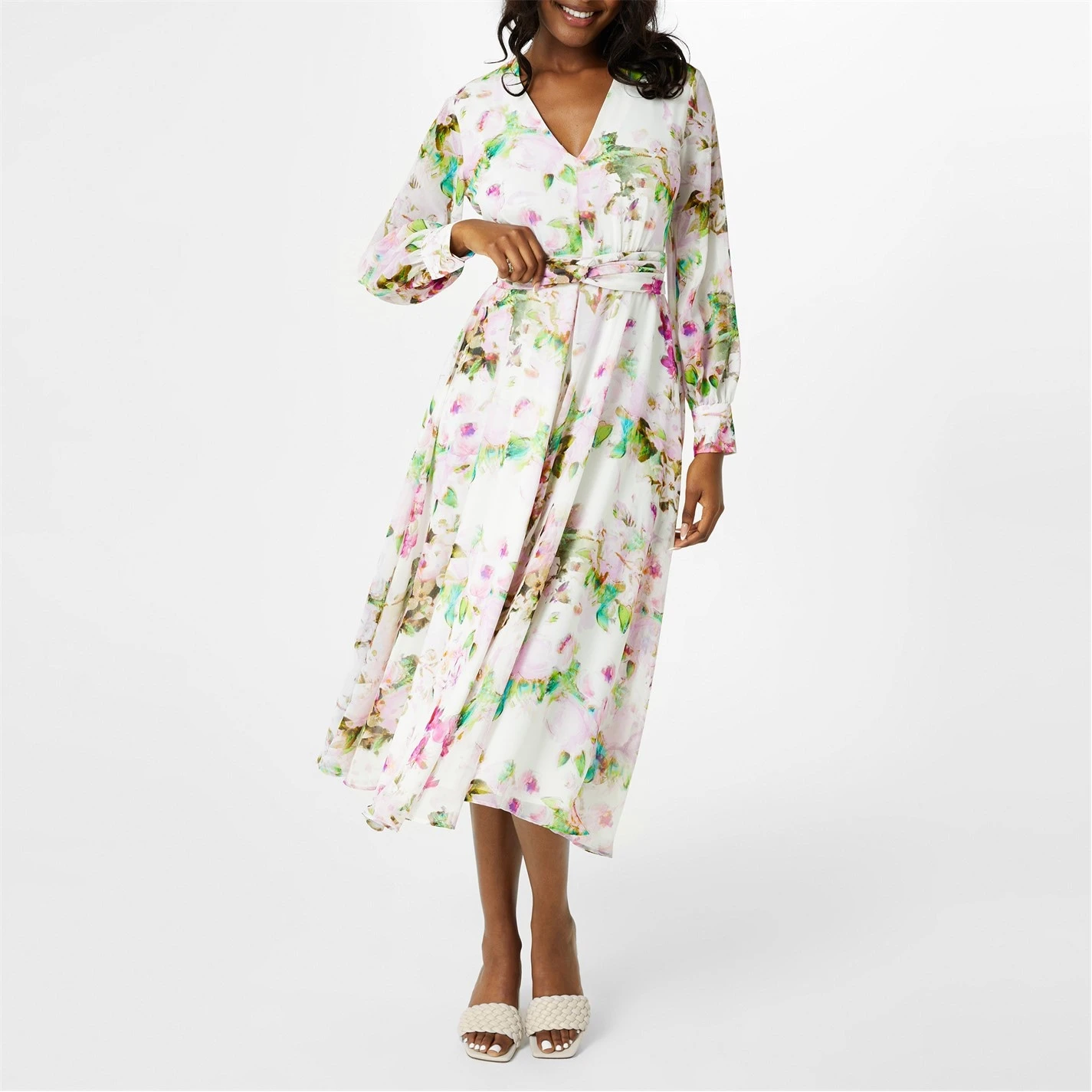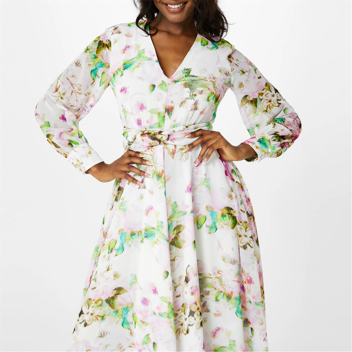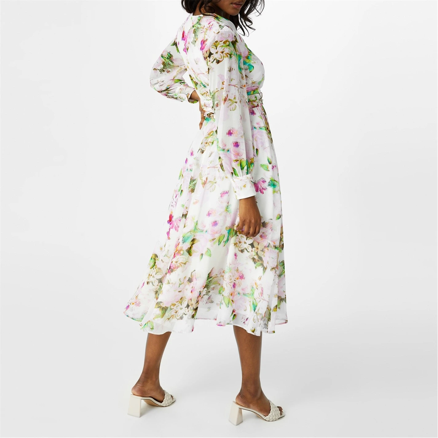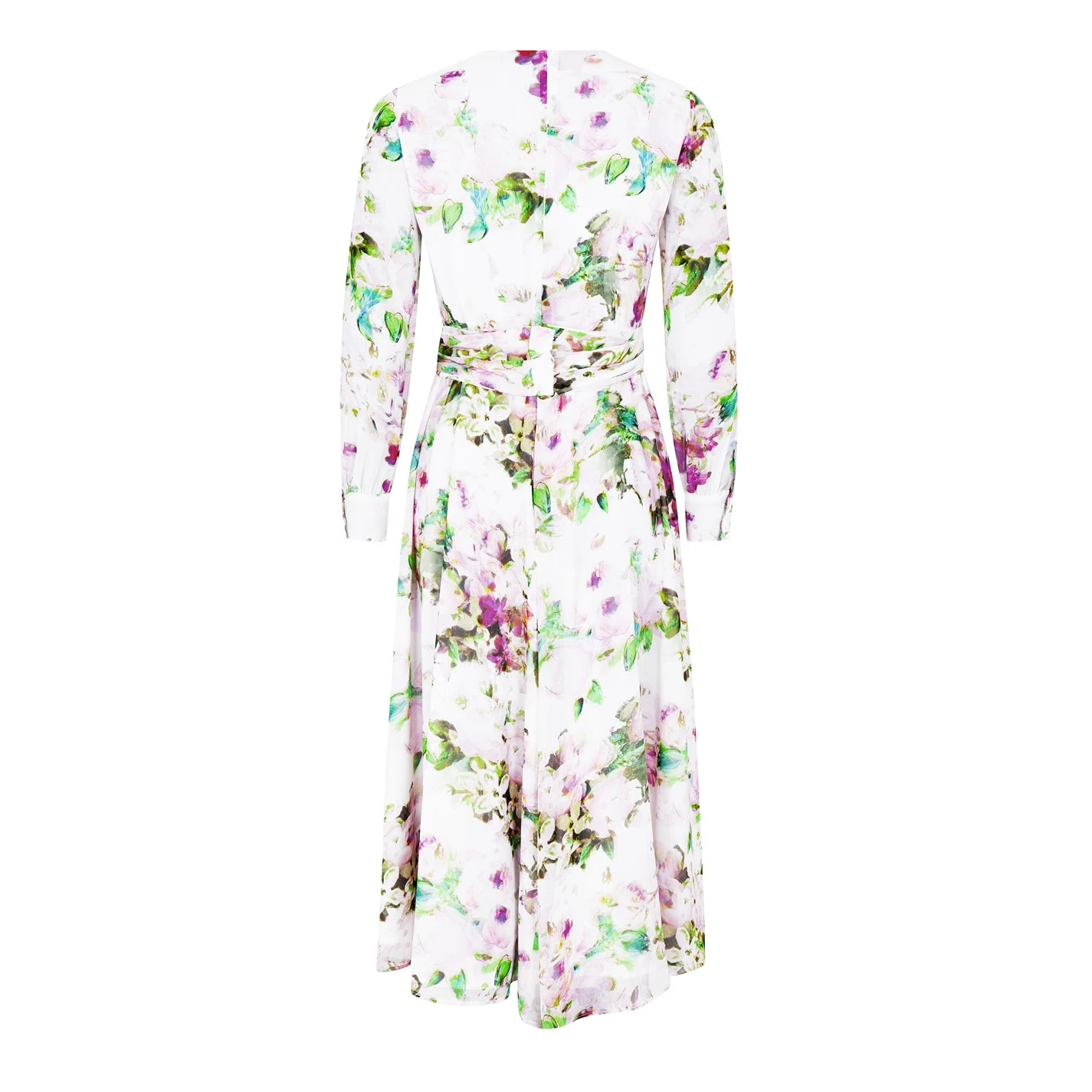 This seasonal Fervore Dress exudes femininity with its floral pattern and flared skirt, whilst its button cuffed sleeves add a formal touch making the look perfect for work. The V neckline,zip fastening and detachable press stud belt make this a versatile look you can adjust so it’s perfect for you. Its sheer appearance is paired with a slip dress for coverage, making this a lightweight chic look.