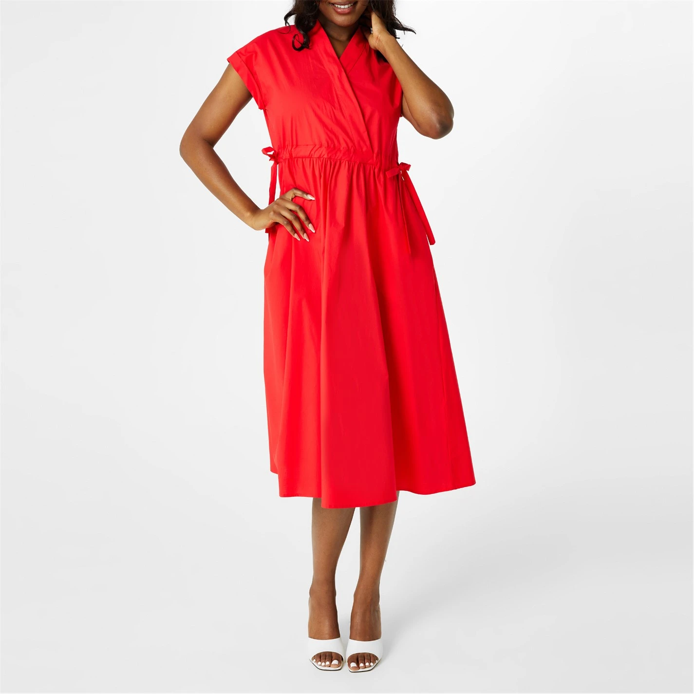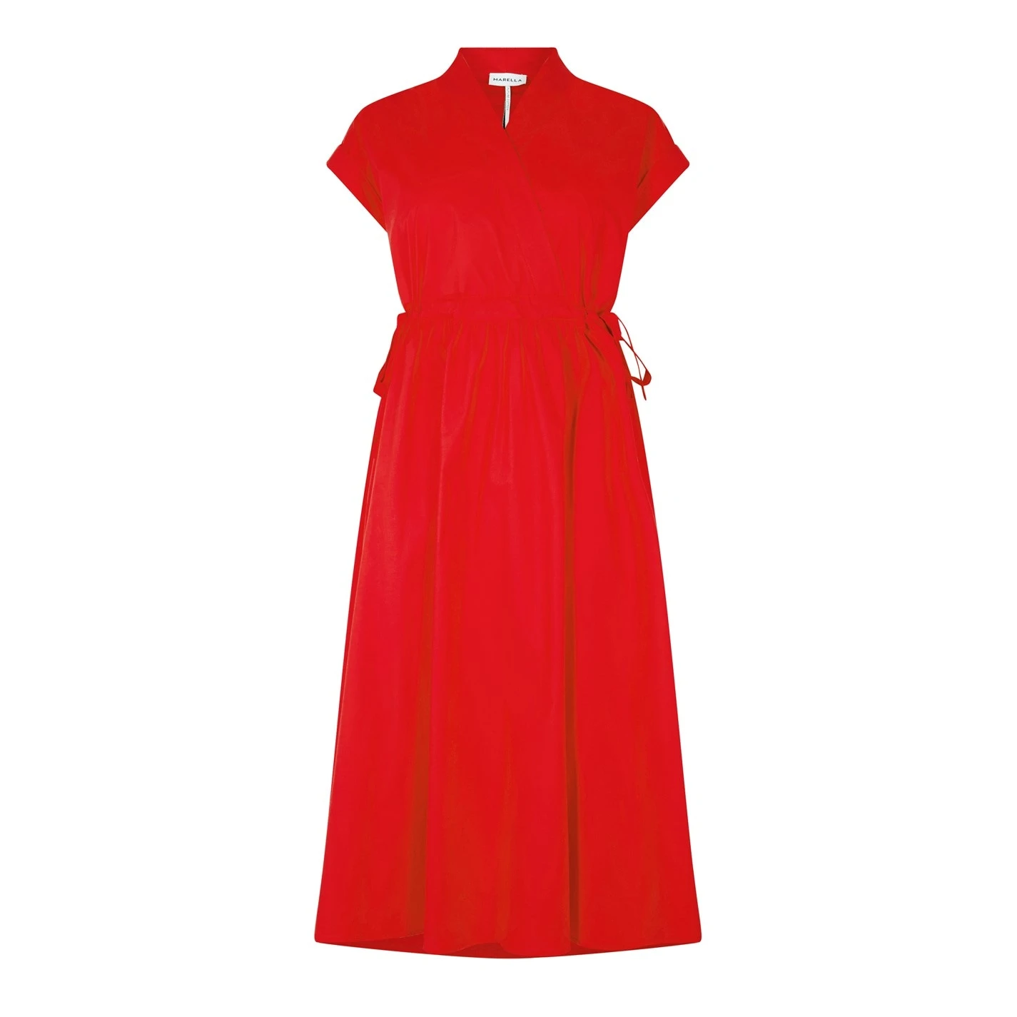 Romantic and alluring this Troupe midi dress from Marella is a must have for your summer dress ensemble. Live in luxury this season with this lightweight look, expertly crafted from a sumptuous , responsibly sourced cotton and elastane blend for a breathable, comfortable wear that is both voluminous with it’s flared skirt and eye-catching colour way. Designed with both fashion and comfort in mind this look can be personalised to adhere to the contours of your with the drawstring waistband with bow fastenings makes for a figure flattering element, whilst the short sleeves enhance your comfort on those warmer days. Offering a plunging V neckline this look boasts a sultry element especially with the wrap around torso, whilst the 2 side pockets allow yo to keep your essentials close for ease of wearing. Machine Wash according to care instructions.