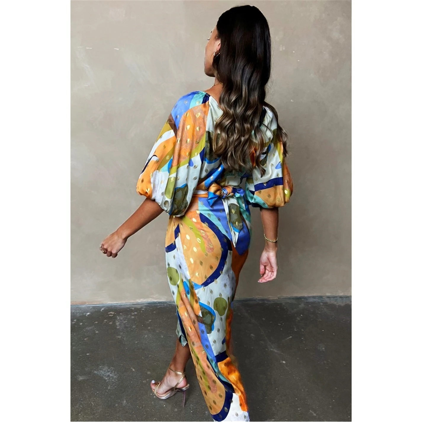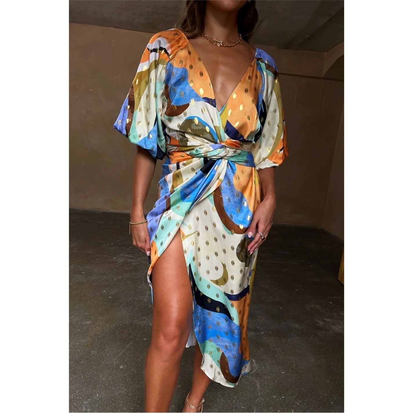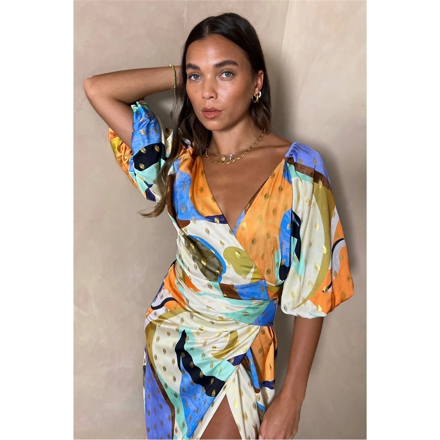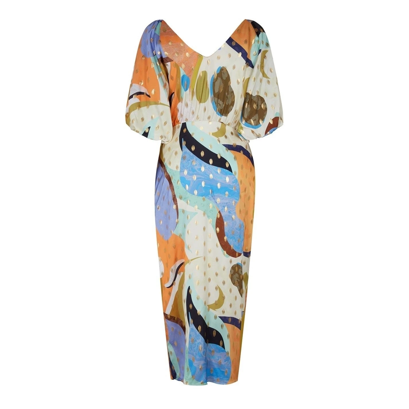 Add style and elegance to your dress wear with this colourful and vibrant Gigi Sadie Dress from Never fully Dressed. Finely crafted in a deluxe 100% viscose construct, this dress comes in a luxurious soft wrap around design. Featuring a classic V shaped neckline, additional comfort is ensured with balloon elasticated sleeves which allow for a more comfortable wear. With an open back and wrap around design, the dress is neatly fastened using a fashionable wrap tie fastening belt. The look is finished in a vibrant multicolour design and completed with glistening gold patterning which gives the piece a shimmering look, that will make a statement wherever you go. Composition: 100% Viscose, Garment Care: Wash 30 degrees, see care information.