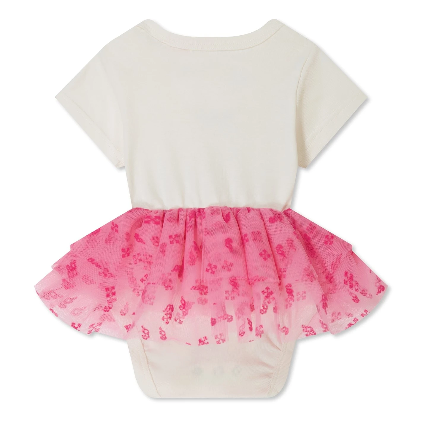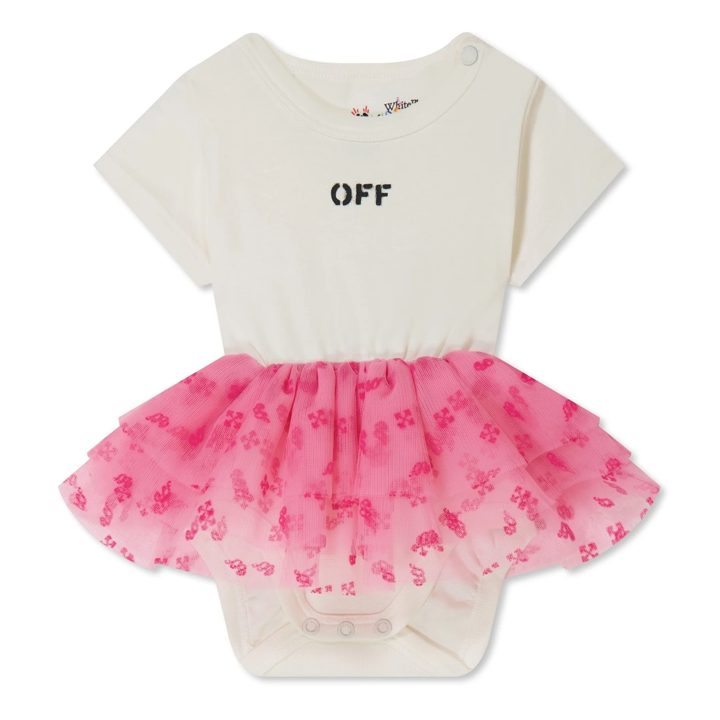 Add a playful touch to your little one’s wardrobe with the Off White Logo Tutu Tulle Dress. Adorning a cotton playsuit styled with a classic crew neckline, short sleeves and popper closures to the shoulder and hem, this piece is defined with a tule tutu accented to the hips for a contrasting but fun touch that execute the brands style effortlessly. Signed off with branding printed to the chest, the tutu is decorated with the signature arrow motifs for a designer stamp.