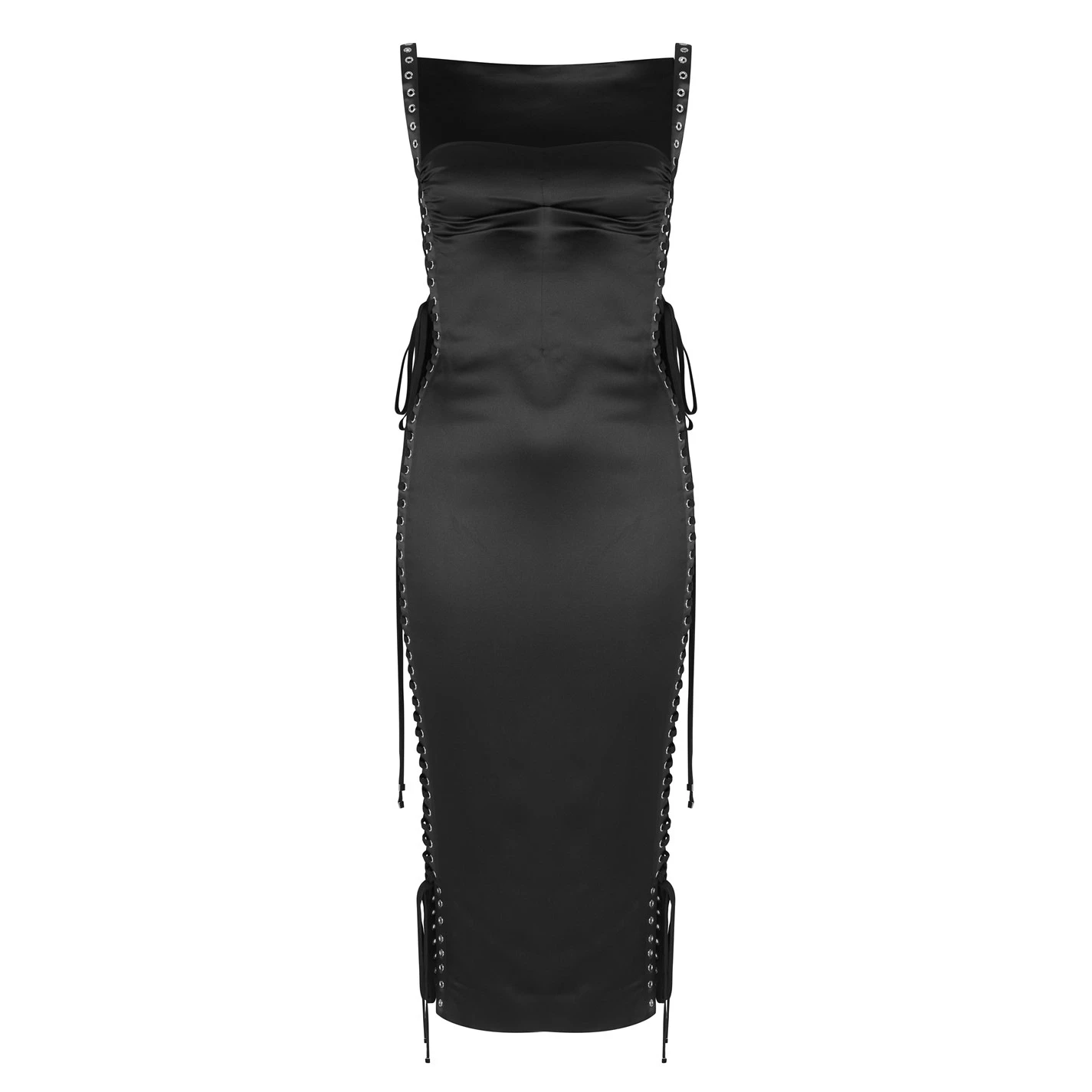 Enhance femininity with the Dolce and Gabbana Satin Corset Dress. Crafted from a soft satin fabrication with a sleek black colourway, this sensual and figure-hugging silhouette is characterised with a boudoir-inspired lacing and eyelet detailing to the side for a provocative but still classic style. With an eyelet embellished detailing to the upper straps, this dress features a square neckline secured with an invisible zipper fastening. Style yours in a personal look by un-fastening the lace trims for a side split detailing.