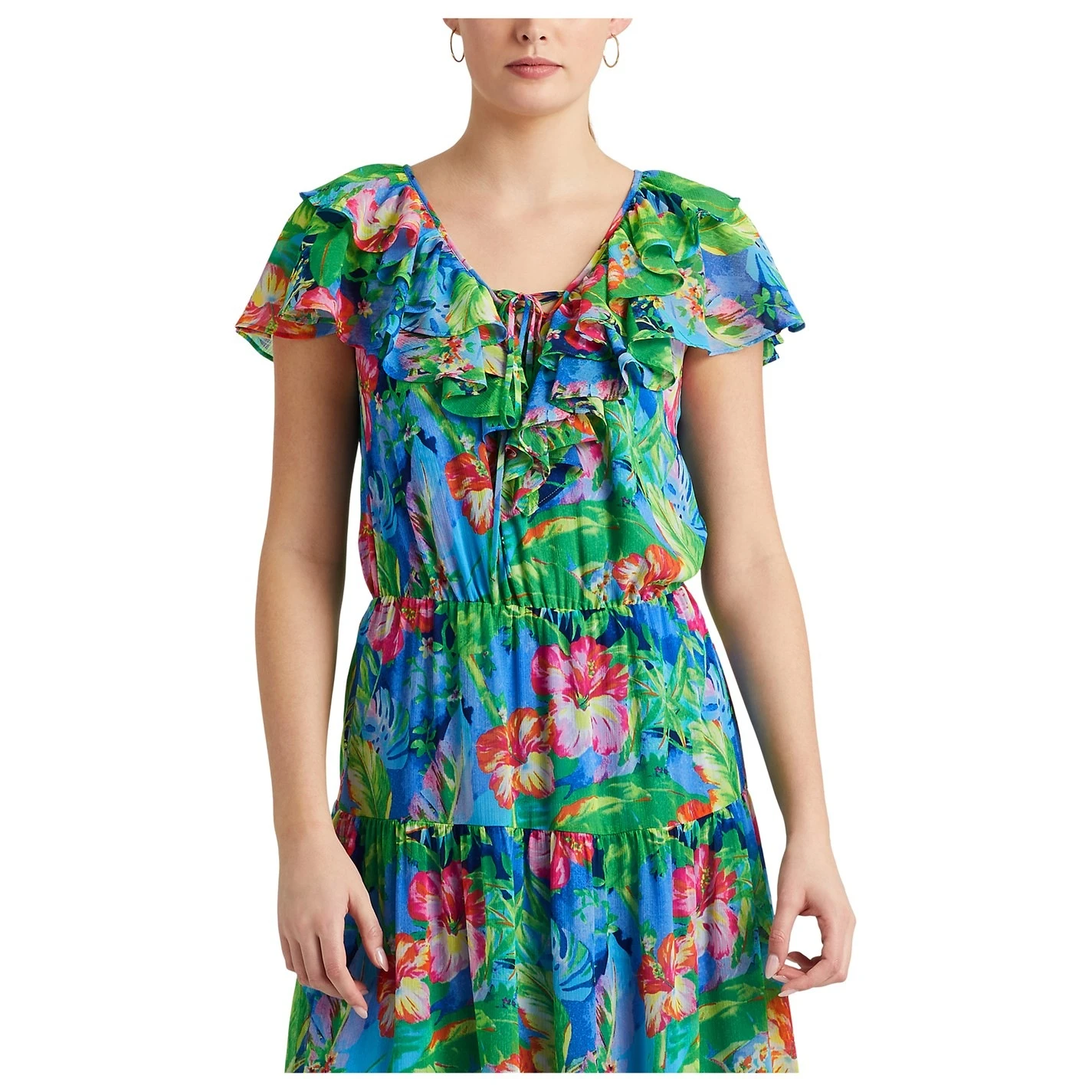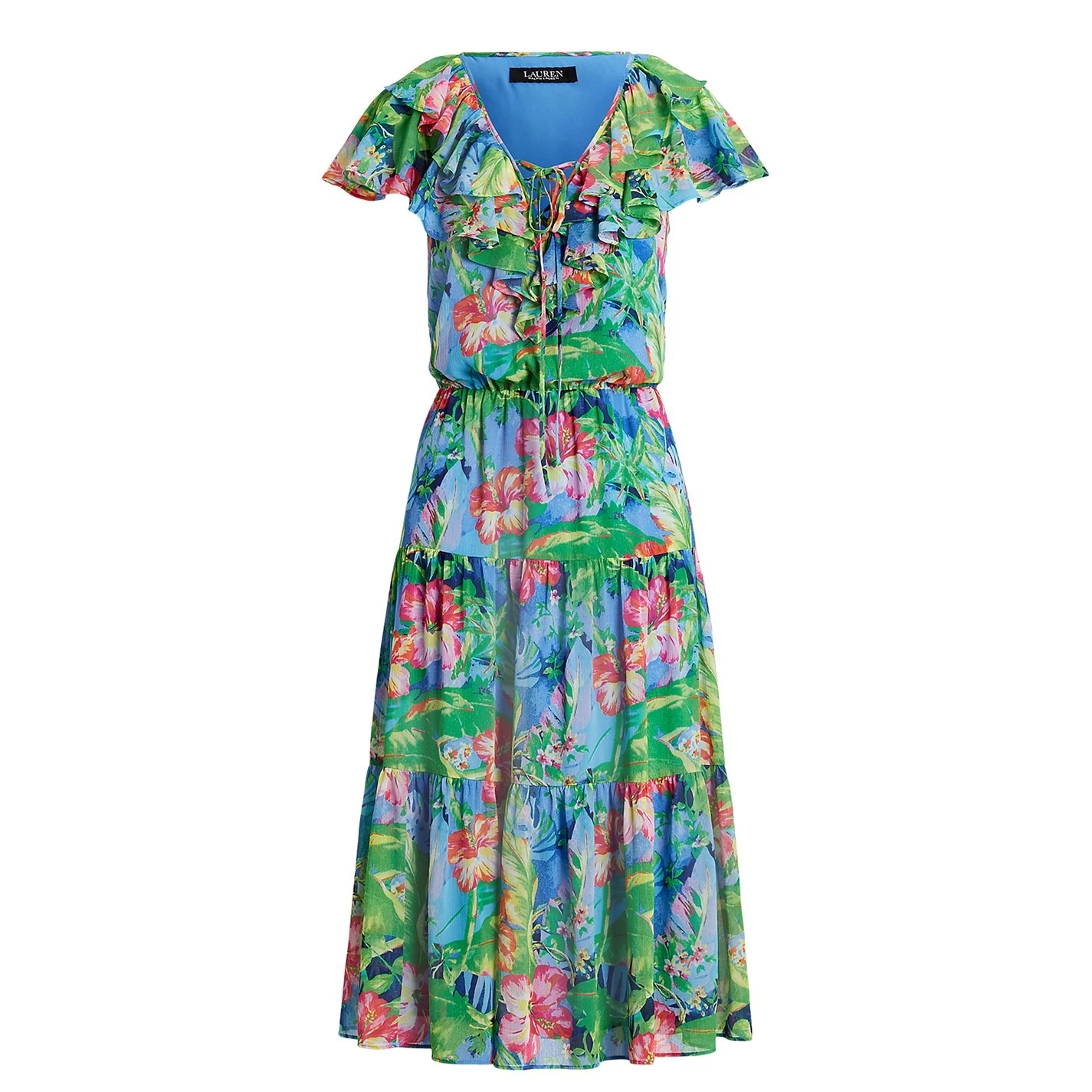 The Lauren by Ralph Lauren Tanmya Dress is an exquisite piece that effortlessly captures the spirit of the season with its vibrant floral motif, breathing life and colour into your every movement. Crafted with meticulous care, the dress features an airy crinkle georgette fabrication that allows it to dance gracefully around you with each step. The tiered skirt adds an element of playful femininity, while the delicate ruffle trim and self-ties at the neckline complete the look with a touch of sophisticated charm. With a seamless stitch, this dress ensures a flawless silhouette that accentuates your natural beauty. Lightweight and with a floaty feel, it embraces you like a gentle breeze, embracing all who wear it with absolute comfort. The influences behind this masterpiece are reminiscent of vibrant brushstrokes on a layered canvas, creating a captivating vision that is both fresh and timeless. 100% polyester. Machine washable, follow care instructions.