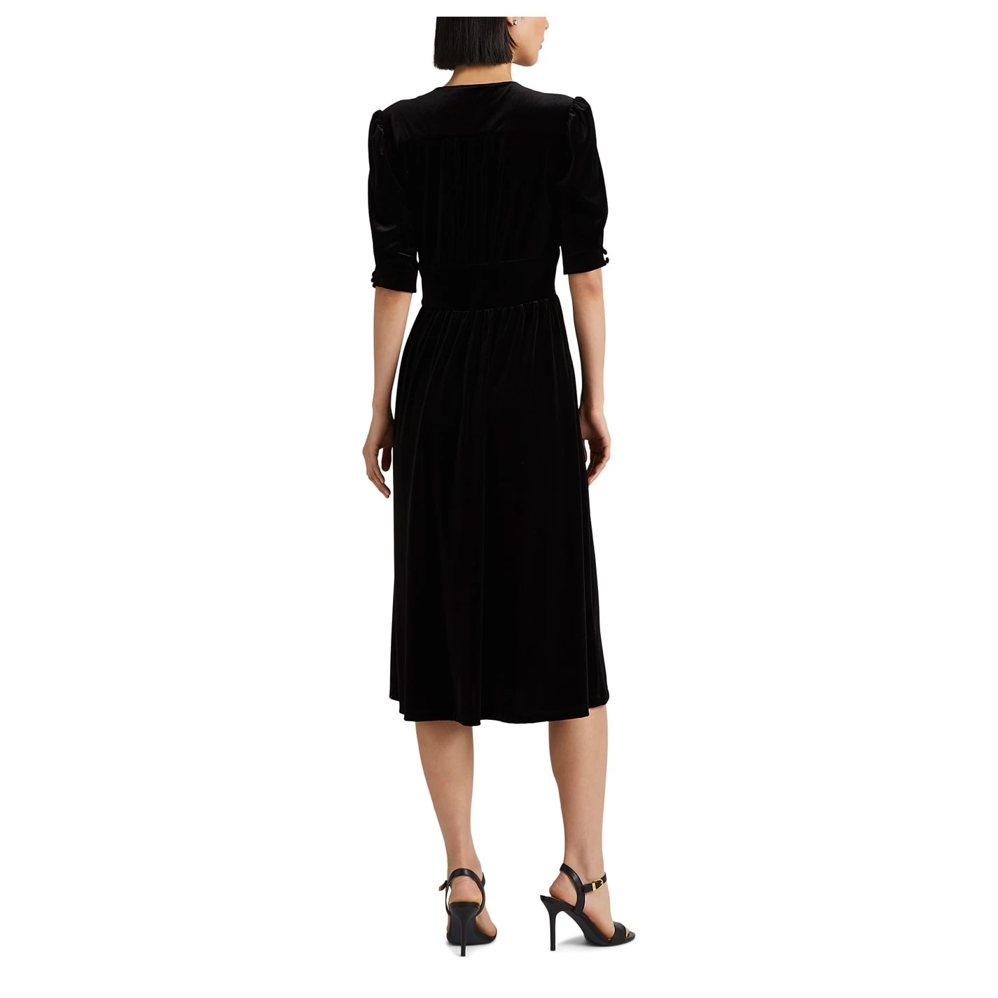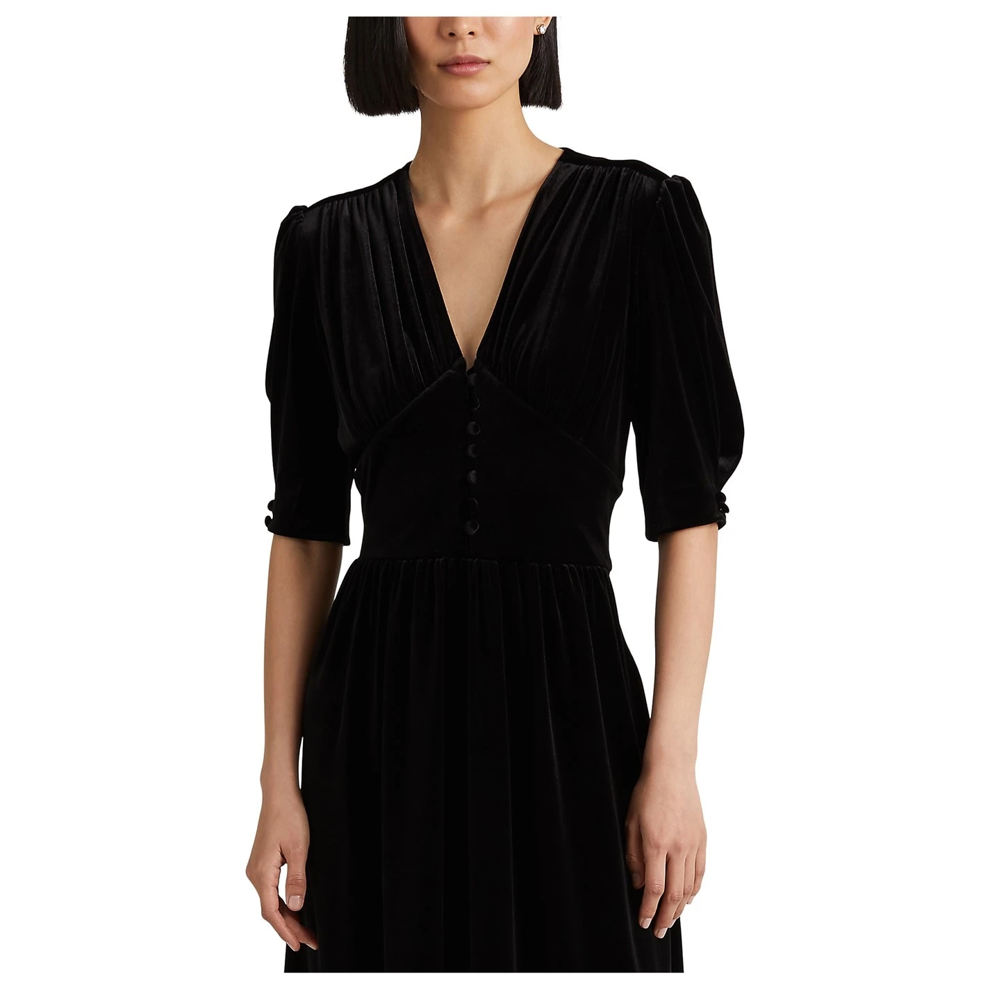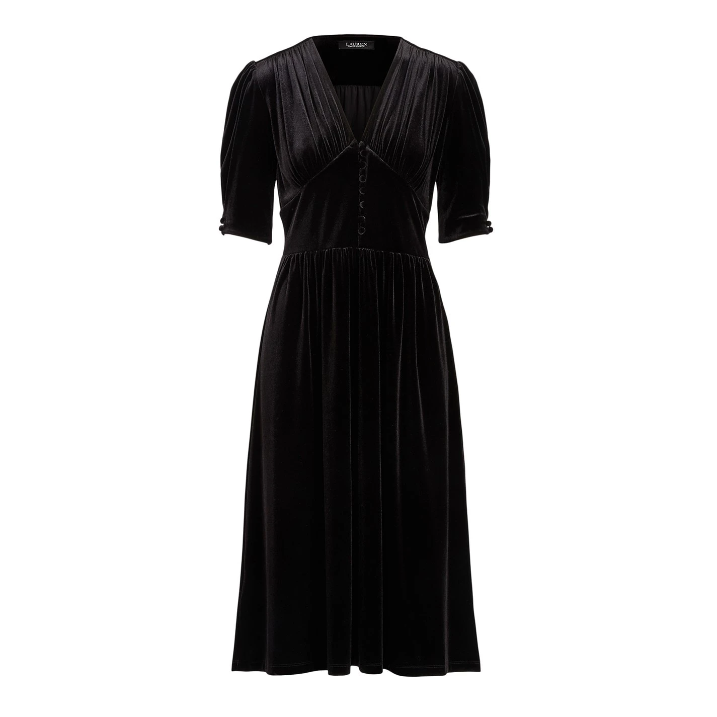 Capturing the elegant essence of Lauren Ralph Lauren, this dress in a luxurious soft velvet, is defined by an empire waist and button details at the front and end of the puffed elbow-length sleeves. There is a concealed left-side-seam zipper with a hook-and-eye closure.